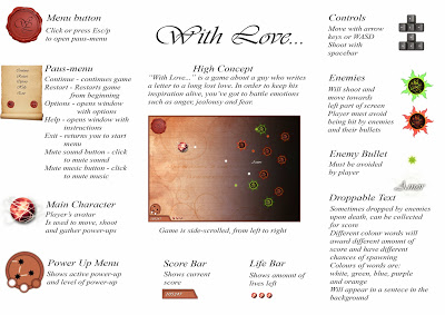 I know it’s been a while since we finished our project but I thought I should post some screenshots from “With Love…” as well as the one page design. The first one is the start screen, the second is the action shot and the last one is the one page design document.