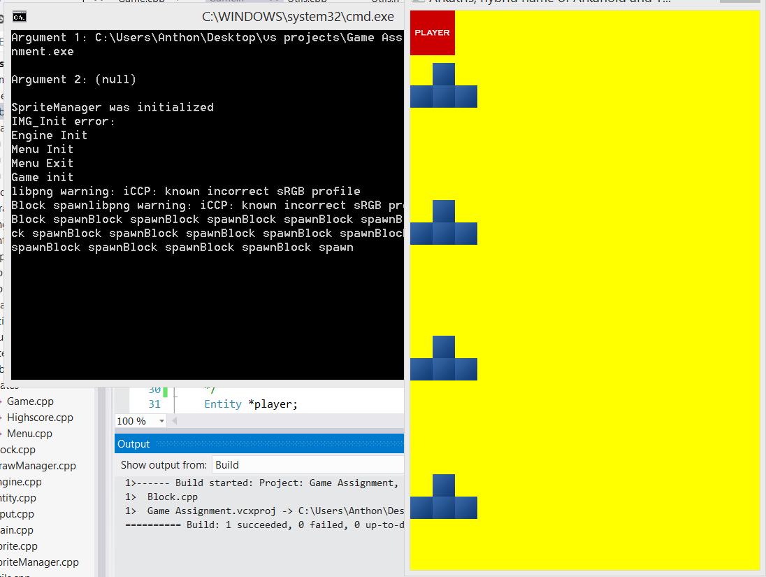 I added blocks spawning in a rate of 1*.6 seconds wich will be changed in future. I´ve also added movement to the blocks. I think I have alot more understanding in pointers and iterators now. First I saw an iterator as a usual integer type but with a different name. But now I know that the iterator points an item in the container which is the vector itself.