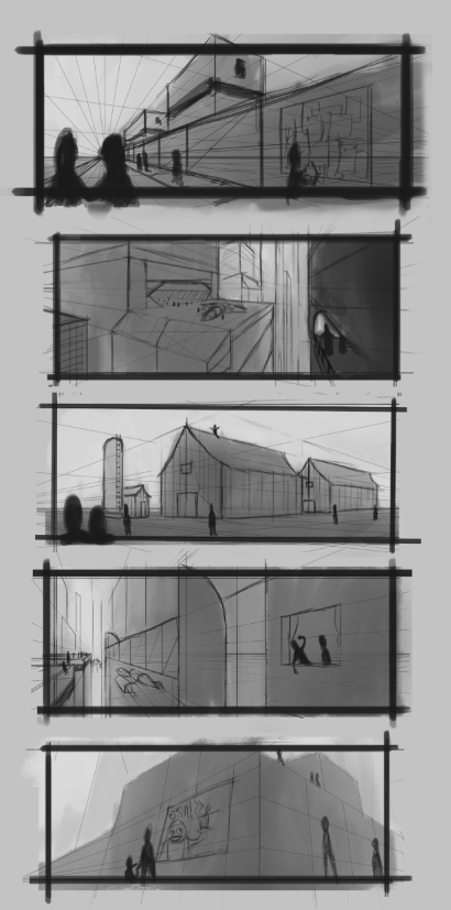 I’ll post some Thumbnail art below. The goal was to create a scene complete with perspective and values in less than ten minutes. The purpose of this exercise was to practice my perspective, architectural drawing, sense of scale and shot composition. I tried out different camera angles and perspectives and I think it turned out okay for the time I had.