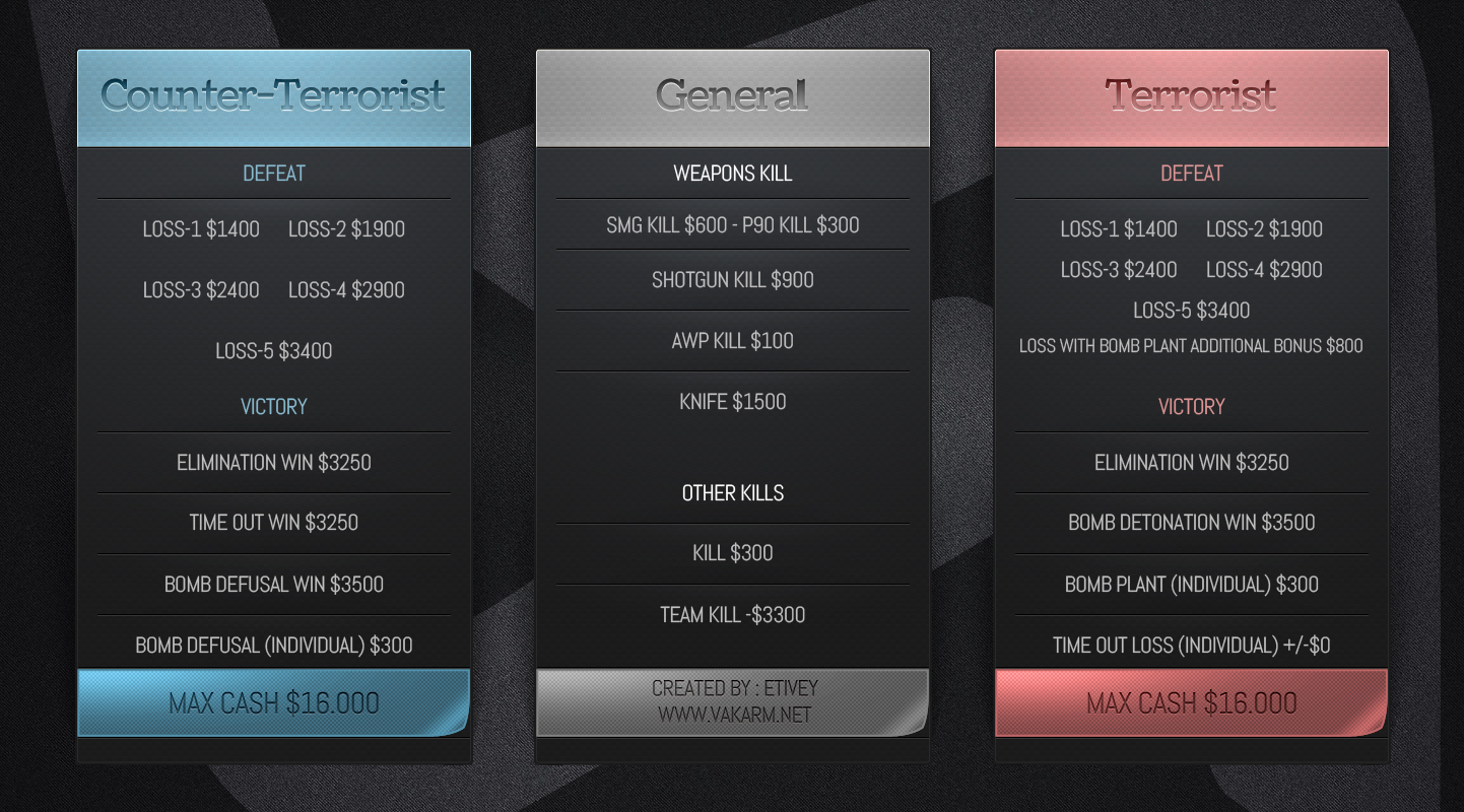 But before I start talking about that, you will need to understand how CS:GOs money system works. This image below belongs to http://www.vakarm.net/ and it explains how the money system works on defusal . What isn’t mentioned here is that each player begins the game with 800$ and a full list of what everything costs can be found here. Each competitive match is played over two 15-round halves (the player swaps teams after 15 rounds) and the first team to get 16 rounds wins.