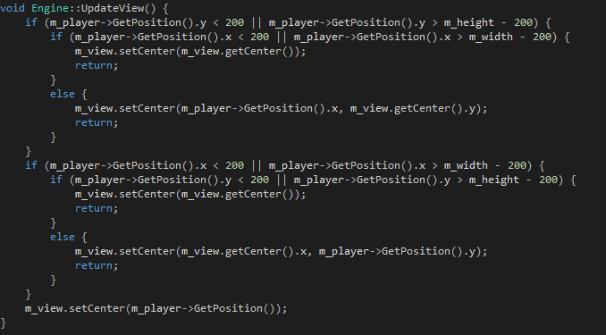 That is, until I decided that I wanted the view to stop following the player if he was nearing the edge of the playing field, this was actually pretty difficult to get to work right as it had to make several checks if it was near the top, top-left, left sides and so forth and then changing the views coordinates depending on which corner you were at. This was successfully fixed ten minutes before we we’re to show our teacher what we had made so far, the math for that fix was: