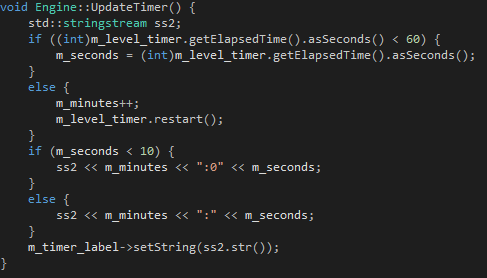 The most difficult part (or, the part that gave me the most problems) of creating the HUD was the timer, which needed a 0:00-kind of setup, and the best I could do was make it count with an sf::Clock that automatically ticks every second on its own, although this just made the timer ridiculous as it just kept going with no regards for minutes, making the timer look like 0:0200 after a while. So I made a quick workaround with if-statements: