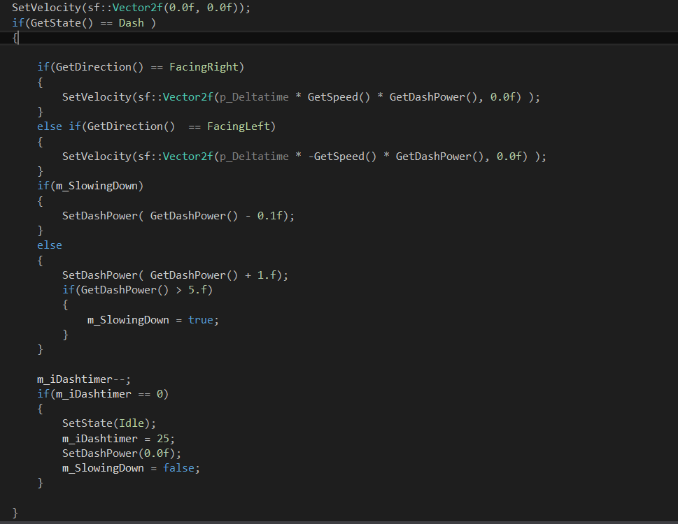 First I check that we are in the Dash state with help of the enums I created earlier. Then I check what direction the player is facing so the dash will happen in the right direction.