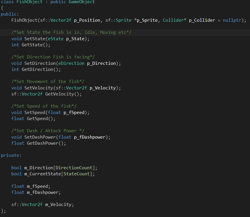 Here is part of the .h file. some things got cut out from the screenshot on top like the 2 enums direction and state I added the other day. This is the basic outline all fish will have. I will build more on this class I will likely add something for animations here as well since all fish will probably be animated.