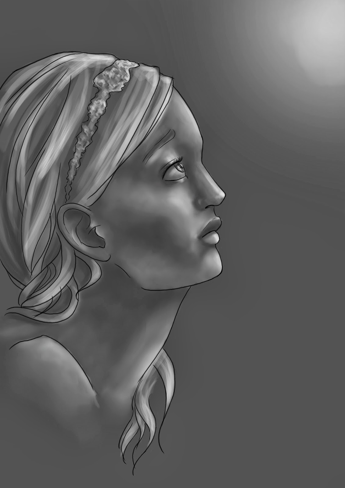This is something I painted in about an hour and a half to practice rendering in grey scale and increasing my work speed, not getting caught up in details. I started with a rough sketch that I cleaned up into line art. I started rendering with a dark background, adding light where needed and blending it with the smudge tool. For the finishing touches I added some extra highlights and I thought about colouring it, but I like it better the way it is. |