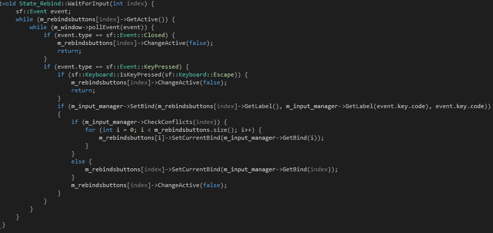 Hello and welcome to this second to last blog post on the makings of this game. So, this week I had some trouble deciding on which artifact to post about as I have been mostly fixing some issues and various bugs in the game, such as having no ammunition if you restart the game after winning and adding a small high-score system to motivate the player not to kill the guards as you now get a ninja-reward if you manage to complete the game undetected and without killing anyone. And so I decided to write about the hardest thing I tried implementing, which is to let the player decide which key binds to use in the game. Now I needed a defined set of actions that I can bind these values to, so after making an InputManager with an Enum containing every handled action i made another map that holds these actions along with a string containing the int returned by the sf::event::keypressed and the string that is the name of the actual button (so the string would look like “11 K” or “37 LCtrl”), so after making about 14 different methods to convert everything to anything I could finally start trying to make the actual rebinding possible. This is when I created another state in the game called rebinds that you can reach through the options-state and added a bunch of buttons (a new class called RebindButton) with active/inactive states and labels and all that stuff, the cool part was that it accessed the actions in the InputManager in order so the first button would get the label of the first action along with its bind for the current-bind-label and then made one button for each action. That made what you saw in the last post possible: