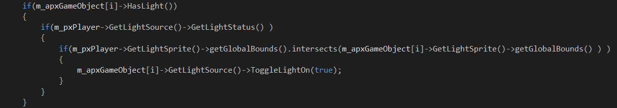 One of the things I have done this week is adding plants that the player can light up using his fishingrod with the light bulb, like so: First I thought about adding a special class for these types of plants called interactive objects but since they will differ so little from normal game objects I decided to keep them in the basic game object class for now, the biggest reason being lack of time. I have already added earlier in code that game objects can hold a light so all I had to do was to enable this light and then use it. It was fairly easy to add and makes a huge different in the feeling of how the world looks. The plan is also to add AI to the other fish that make them attracted to these lights but I’m not sure we will have time to implement that. So the circle for the plant light is cut out of the dark surroundings the same way as the player light circle mentioned in earlier posts but then I also added a sprite for the yellow light you see in the screenshot for both the player and the plants to make the illusion that the light bulbs actually emits light. It’s hard coded?? (It’s coded in a non-dynamic way) So the position for these sprites is fixed with numeric values, which is not that good but at this point it’s all about getting our features into the game before time runs out. Then I started adding collider boxes for the plant light bulbs so the program would know when to turn them on or off. For example when the player light bulb is close in range it would light up the plant. Instead of changing how our collision is handled. Changes that can cause our other objects to behave differently I decided to look for another solution. I found one in SFML. SFML have a built in function that checks if a sprite box intersects with another sprite box. It’s called Intersects() and since I now use a sprite for the yellow light on both the player and the plants I could simply just check if these intersects and if they do light up the plants light bulb for a set amount of seconds. Here is some code of it: First I check if the game object has a light. If it has I check the status of the players light bulb (on or off). I then check if the player light sprite intersects with the game object light sprite and if they do the game object light is toggled on. Right now the timer is on 10 seconds. After 10 seconds the light on the game object goes out. This feature isn’t a “game changer” but it adds a lot to the atmosphere and feeling of the game world making it feel more alive. The feedback I got from testing this feature was really good by the people who tried it so I’m quite happy with it. |