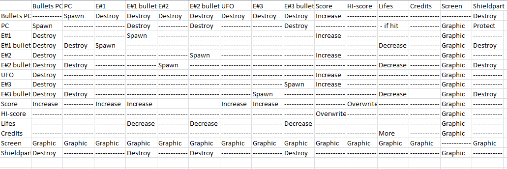 • Enemy #1 – Graphic, location, speed, hitbox, HP, Several bullets on screen, points. Moves around on the screen simultaneously with other aliens and spawns bullets at given location.