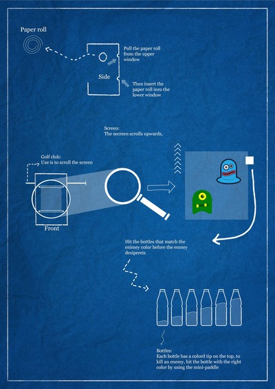HOW TO CREATE THE PAPERPROTOTYPE Needed: 1 box, 1 golf club/pole, 10 or more A4 papers, 2 pencils, 1 mousepad, 6 glass bottles Prepairing the Paper Roll: Attach 10 or more A4 papers to eachother in a line and paint different types of monsters on the blank sides. The monsters has to be in either 1, 2, 3 or 4 colors but not more. Prepairing the Box: Put the golf club/pole through the box and attach the paper role to the club/pole on the inside of the box. Cut out two hollow stripes on the front side of the box for the paper roll to scroll through. Prepairing the Drumsticks: Tape a piece of a mousepad (square form) at the end of the pencil (Do this on both pencils.) Prepairing the bottles: