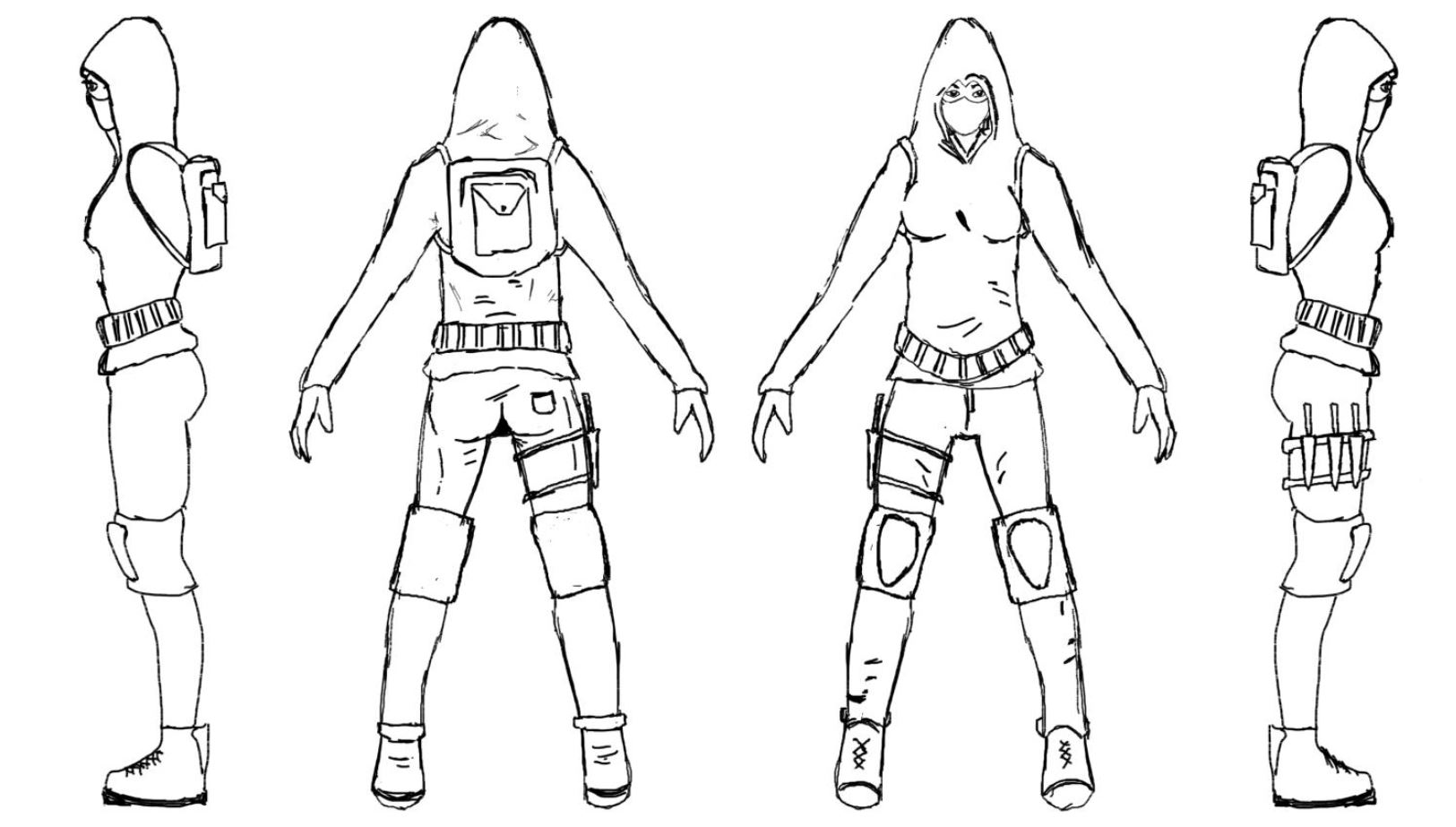 I designed my character with a casual cloth, she is a teenager and fighting chaos in a modern time. I putted kneepads on her since this will show that this character are not afraid to get her hands “dirty”. In the game there is alien invading planet Earth and I trying to think how that would looks like and get the understanding how it would be. I would probably not just run in with my guns and shoot on every alien I see, I would probably try to sneak around and plan my attacks. This is why I designed the hoodie and a mask that covering her face except her eyes, I think gets a bit feeling of that she is sneaking and being cautious. She got two pistols as a main weapon and got knives on her right legs that she can use in melee and also throw in range area. The backpack will represent her inventory, she collect items and craft useful weapons, traps, ect.