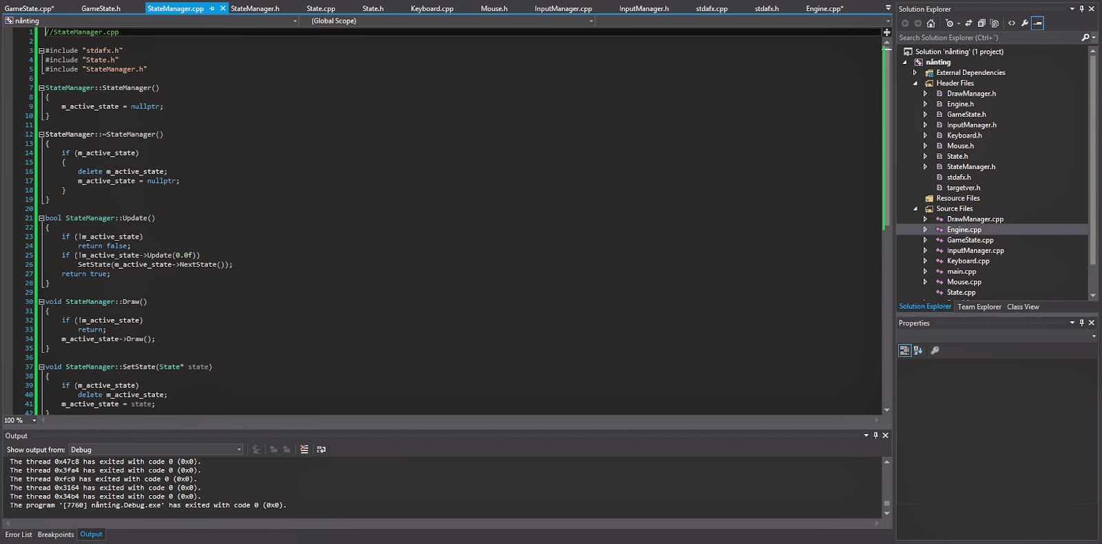 Allting ligger under .h och .cpp filer. När man gör ett större program så behövs det, men när vi skrev pong för några veckor sen så skrev vi allting direkt i samma fil. Det här systemet är mycket lättare att hålla koll på, det blir mycket hoppandes fram och tillbaka mellan de olika filerna men allting är mer strukturerat.