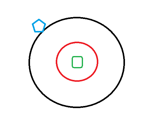 Här ser vi Alien som en grön fyrkant i mitten. Den röda cirkeln är avståndet spelaren behöver befinna sig inom för att den ska skjuta och dela på sig. Den svarta cirkeln är avståndet spelaren behöver befinna sig inom för att Alien ska röra sig emot spelaren. Samt den blå femhörningen representerar spelaren.