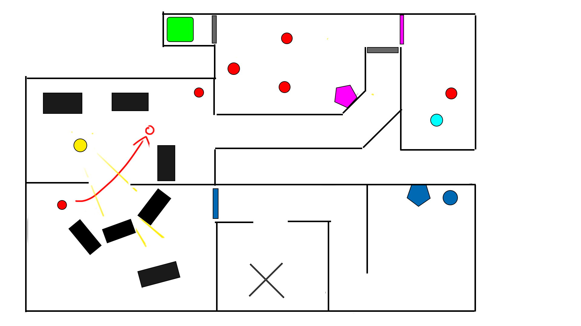 - Dark blue circle: Crucial pickup. In this case, it refers to the weapon the player must use throughout the game. (May be changed or removed for later iterations.)