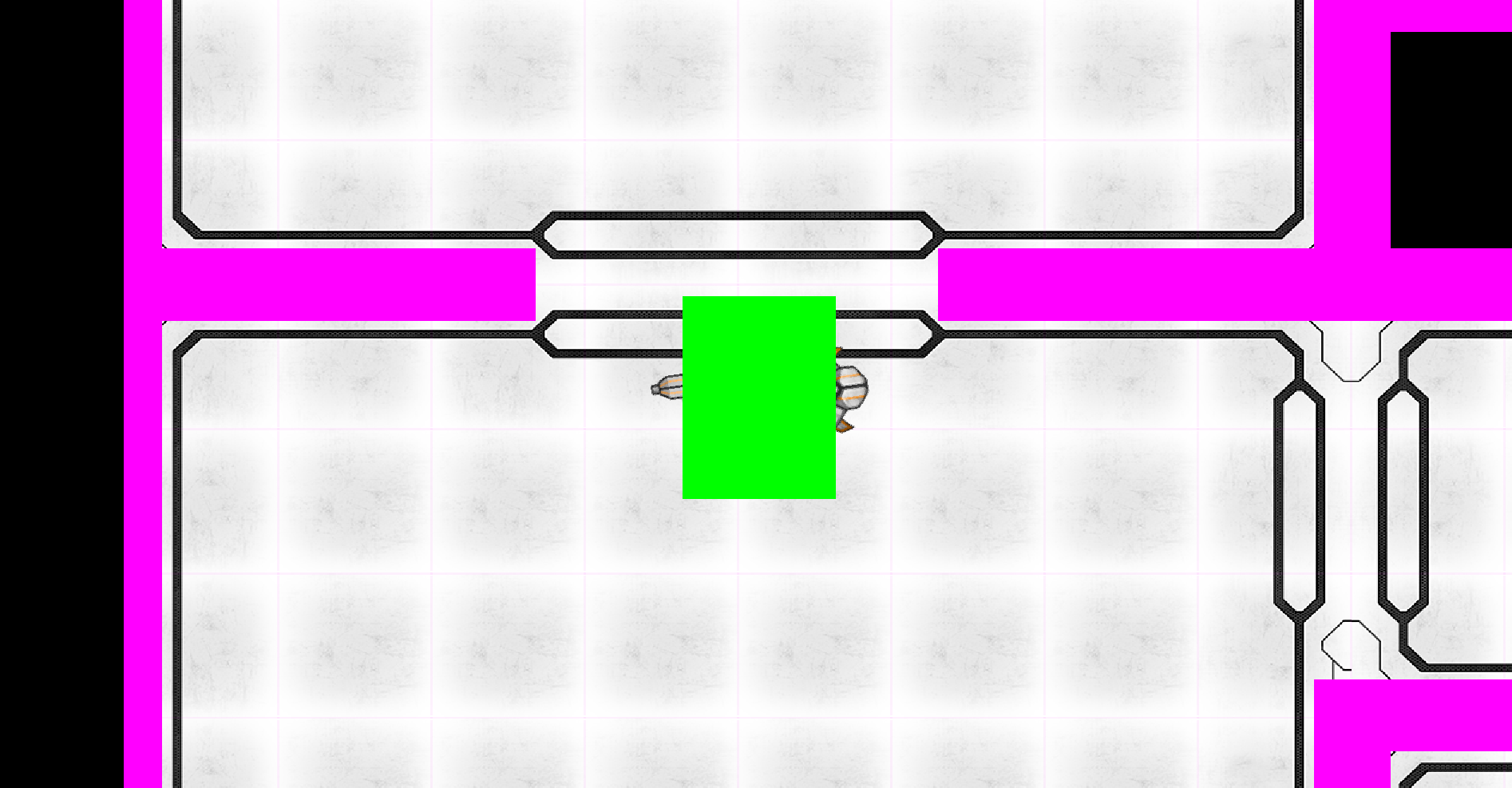 I said before that I will be the one putting the levels together as well as designing them, and that I have done for this first section. Below is an image of how the environment will look to the player ingame. The green box covering the player is the hitbox and the pink ones are the hitboxes for the walls. A collision between the green and pink box will result in the player stopping and bouncing backwards, away from the wall.