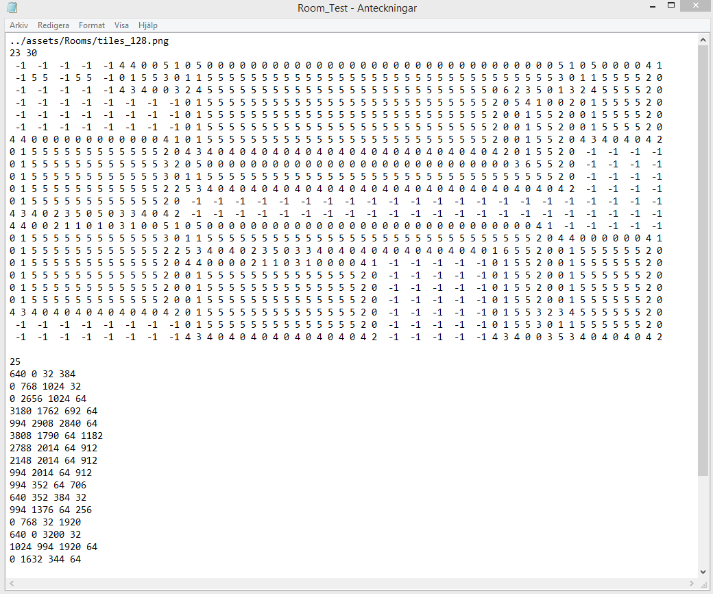 The upper half of the file which is a huge wall of numbers, decides which tiles go where. The first two rows choose the file from which the tiles are selected and how many rows and columns there will be. This will take a long time to explain, so I will try to be as brief as possible. The number ”-1” means a tile space is empty. The others are the positions of the tiles in the image where they are stored. The number ”4 4” in that case means the tile in row 4, column 4 in that image. The lower half of the file decides the amount of hitboxes and their coordinates. The very first number on top of there coordinates indicate how many hitboxes are to be placed. I struggled for a good while with the hitboxes as I had seemingly deleted this number when I first edited the map and I would frequently forget what hitbox went where and how far away coordinates where in relation to each other, so I started keeping notes on the side to remind me where everything was.