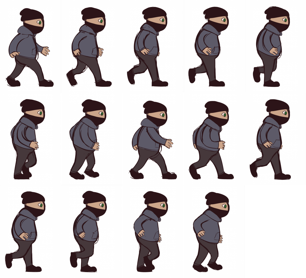 The lines were not cleaned up, since this animation was only for functionality, not looks. Once I had the first frames done, I began sketching out “inbetween” frames, also known as “tween” frames, to smooth out the movement. I repeated this process, copy-pasting previously drawn frames and editing them to save time, until I had 14 frames in total and a complete walk cycle. At that point, I began to fill in the sketches with colours, keeping them flat and simple, but covering all the parts of the player avatar. This to see how the avatar’s colours would compare to the colours of our prototype level design. Once that was done, I compiled them onto one page, a so called sprite sheet: