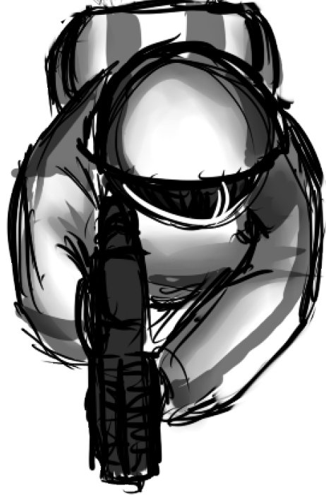 The first iteration of the astronaut I made to fill out the square picture as much as possible because the picture was supposed to be the hitbox for the character. The problem with this was that the rifle the astronaut is supposed to wield had to be very short in order to get the picture as small as possible around the astronaut. The second thing I tried to fix with this small boxy character was that in order to make it easy for the programmers I tried to make the astronaut hold the weapon in the middle of his body because when the bullet spawned it spawned from the center of the image. This solution with this boxy astronaut worked, but it did not look very well. In the playtesting that we had in the beginning of this week many people said it looked like the astronaut held a blowgun to his mouth, through a spacesuit. Obviously this is not a desirable solution and that is why I have started working on a new variant of the astronaut. In this new iteration I have skipped to try and make the player fill out the entire picture and instead we have decided that the programmers will create a separate hitbox on top of the image in the game. This gives me a lot more freedom in designing the astronaut and it makes the character look more correct in way of posture. This is the second iteration of the astronaut and as you can see this looks way better than the first iteration. But the problem here is that when you wield a weapon you don’t hold it straight forward but rather turn your upper body so that the weapon is closer to your body. And the reason you hold a weapon like this is because the left arm of your body is not as long as the astronauts left arm is right now. I turned the body of the astronaut quickly in photoshop and ended up with this result. This looks correct and representative of how a person would hold a weapon and the body looks correct. But this variant has yet another major flaw that makes it unusable. Right now the weapon is pointing forward but the thrusters on the jetpack is completely skew. So this would not work in the real world. That is as far as I have made it in the process so far but hopefully I will find a solution until the alpha demonstration on friday. Tagged: astronaut, game project, iteration, problem solving, Weapon |