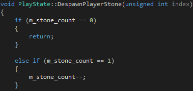 DespawnPlayerStone checks how many stones the player has, and defines when a stone will be spawned again after a despawn. The code for this looks like the following: