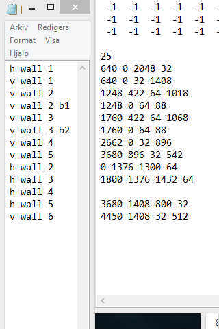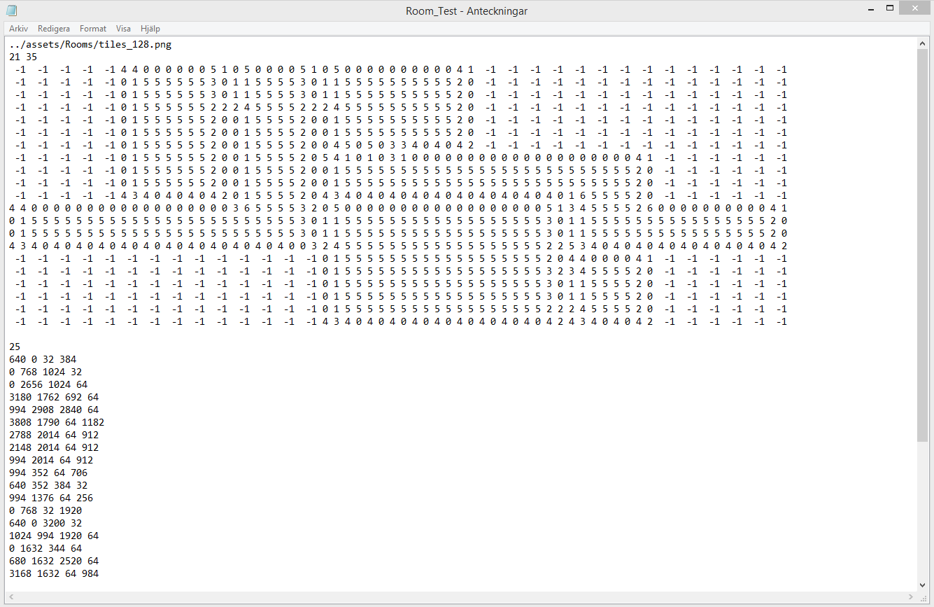 The lower half of the text file says where to place the hitboxes. The initial number determines the number of hitboxes, and the following sets of numbers are the coordinates x and y, as well as the horizontal and vertical width of the box, in that order. Following the list of hitboxes is the list of enemies. It is sturctured the same as this list, except it doesn’t require the height and width, as the coordinates for the spawn point is all that matters. Previously I was having quite a lot of trouble working as I constantly forgot what hitboxes went where. Adding notes next to the numbers will cause problems when the game is started, so I did what I should have done from the start… I created a separate text file, that I can simply align with the hitboxes to find out where they are.
