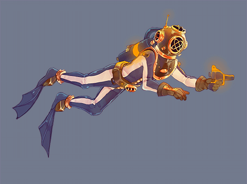 This week I’ll be talking about my process in the making of the main character’s animation. First off, I did a very loose sketch of how the animation could look like, even before the base sprite was finished. This was to just feel if I could really pull off a swimming animation and to give myself some time to consider how to work with it. So, here is the first sketch which I worked from: It only includes the basic, main frames. I knew I would have to add more frames to have it look smooth, and also put some more work into the dynamics of the flippers. I did not want it to be a super realistic swimming style, as long as it was obvious that the character was swimming. I am aware that the feet and legs are generally in a higher position compared to the head while diving, but I wanted the head to be the main focus and to really have the character looking forward. I decided to take the animation in small steps, since I knew it would be difficult for me to animate. I have never done it before so I needed to figure out the quickest way for me to do it. Since there is a lot of details included in the finished base sprite (which can be seen below), it would take quite a lot of time to draw each frame. This is when I thought of skeleton animation; where there is a base skeleton underneath, which is used to move the character around. I decided to use that as inspiration and did an extremely simplified version of the techique. Since I did not have a ”base skeleton” I just used the simple method of copy and paste, and redrew the parts that needed fixing. All frames were basically created out of this one: The first step, to me, was to get the legs moving. I focused solely on the legs, excluding the movement of the flippers. This version would only include the main frames, and consists of only 6 frames. Which makes the legs movement a lot quicker than planned and not very smooth. Here is that result: After that, I thought it was important to get a good look for the flippers. The previous version makes them look very stiff and it’s just not working. If I’m going to be honest, the flippers were probably what took me the longest to do, mainly because I had a lot of problem getting them to look natural. Eventually I ended up with this; It’s still not smooth or in the speed it’s planned to, but it does look more natural. After this I started focusing on the arm’s movement and adding the light which will hang from the belt. The arm holding the pistol will eventually be completely removed, since it will be separate object moving along the cursor. After struggles, several extra frames and a lot of redrawing, I ended up with this: This is the current finished version, but will possibly be worked on again before the final version of the game. |