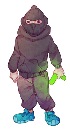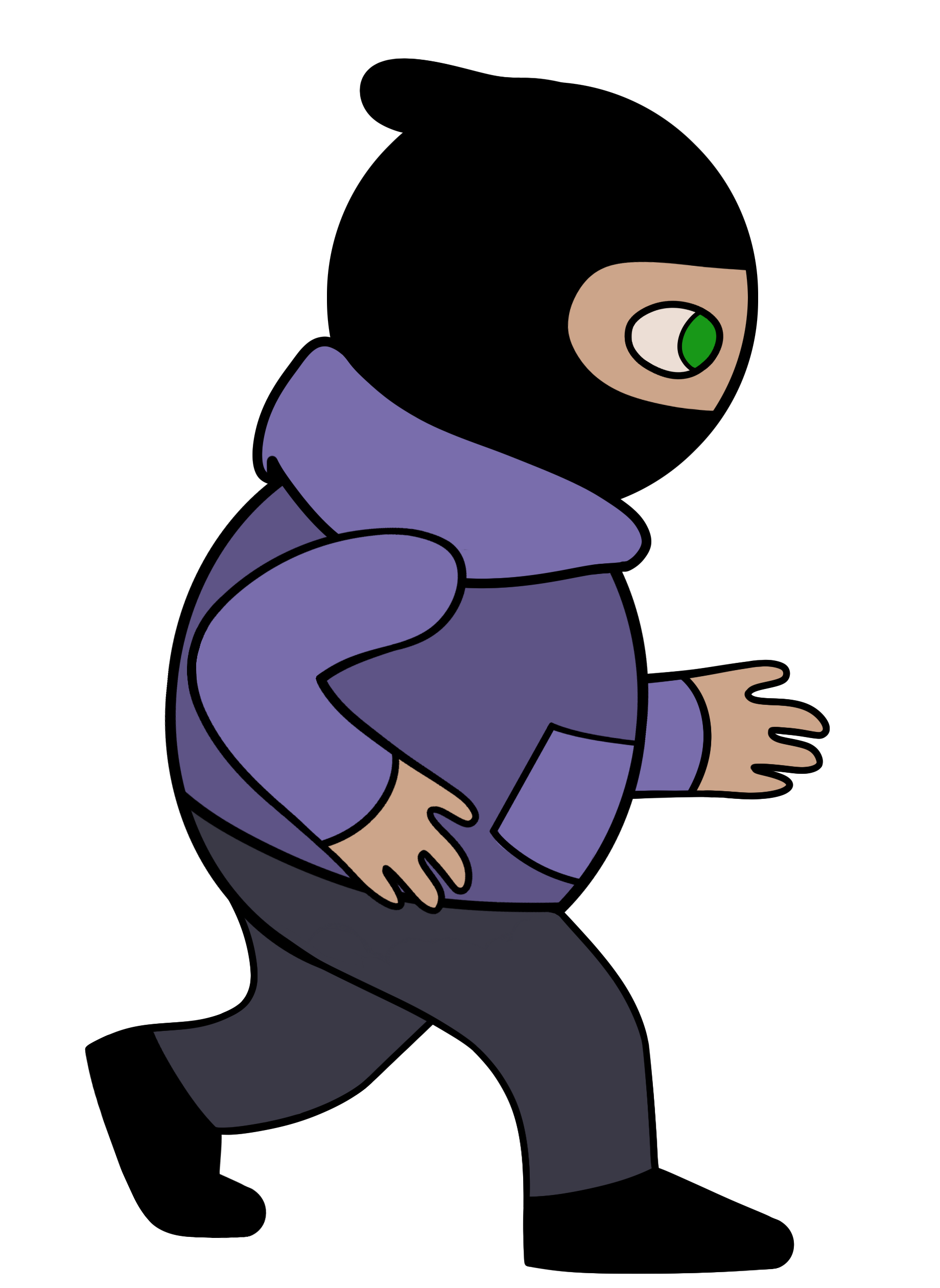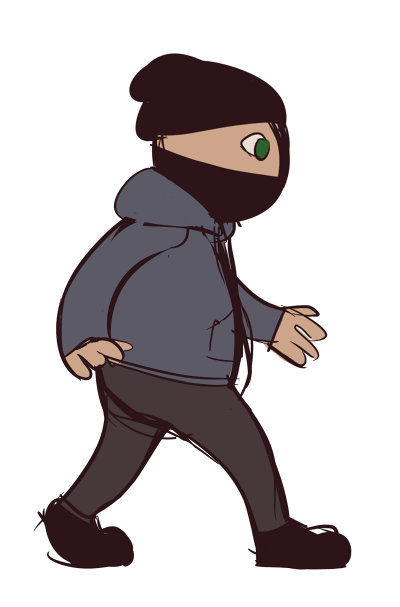 Another week has passed, and it’s time to write down the current process of building up a game, piece by piece. And what is the game my team and I are working on? For starters, it’s called “The Fancy Mansion Heist” (working title) and it’s about a burglar breaking into the luxurious home of Mr. Otto von Fancy. There’s an accomplice waiting for the burglar outside the mansion as well, but they are never seen within the actual game, only communicated with via the use of a mobile phone. For the past few weeks I’ve focused mostly on the player avatar, the burglar, as they are the prime focus of the game. But what I’ve forgotten to mention so far in my blog posts is my thoughts and process behind designing the look for them. This is the concept artwork of the player avatar from the group who made the Fancy Mansion concept, team 15. They described the burglar as a modern and gender-less individual, so anyone would be able to identify with the character. This was something I wanted to keep while designing our version of the game, yet I knew I also had to make the look a lot simpler to make animating them doable. So I proceeded to sit down and draw out what I thought could be a good design. I kept things as simple as possible, with few lines and some edits to the design, clothes-wise and colour-wise. At first I had an idea how perhaps the burglar’s mask was just a piece of cloth tied over their lower face and with a hat on, but this idea didn’t go over so well with the rest of my team, saying that it makes for an odd head shape. The eyes also struck them as not the best idea, so all this was changed in later designs. This is from a test animation where I had only changed the eyes and made the shoes all black (a detail we decided to keep), but where the mask was as of yet unchanged. In the end, I decided to go back to the concept design of the burglar, and use the burglar mask as it was, albeit simplified and all black. This is another still image from a separate animation, where a simpler mask design had been implemented and the colours were brightened up a bit, after further input from my team members and other people. As I’m responsible for animating both the player avatar and the antagonist, I’ve had to figure out shortcuts to lessen the time spent working on each animation required. Which is why I opted for simple forms with even lines this time, to make copypasting easy and quick. The lines I used were too thin, however, and the colours looks too plain against the in-game enviroments. So for the next step I’ll have to thicken the lines and include some simple shading on the character, to make it fit in with everything else better. I will also re-think the torso piece of the burglar, as I feel it might have gone too far away from the originally intended gender neutral design I wished to keep. More of this will be discussed in next week’s post! See you then. /Addis