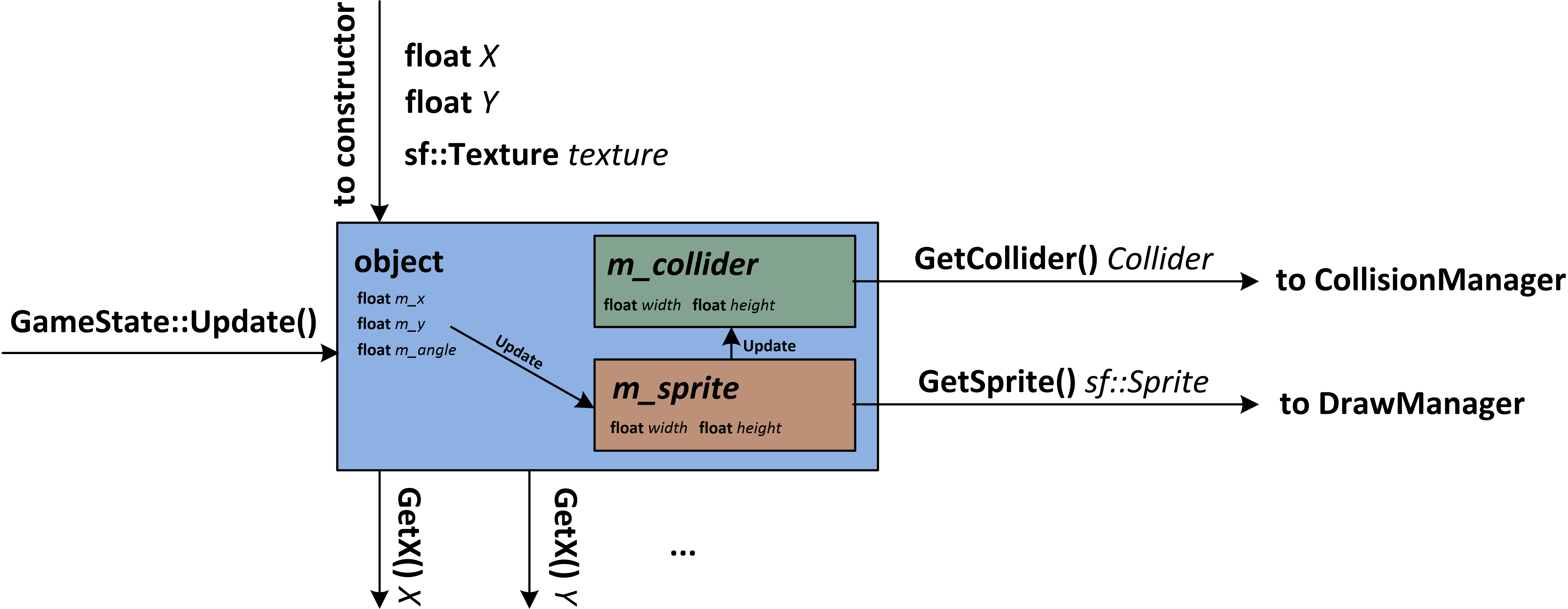 Looking at the diagram above, loaded texture would be passed to oject constructor at the time of its creation. The object class would create a sprite for itself. GameState::Update() function calls every object’s update function. In this case, the object would first update its member variable values and then internally update its sprite properties, such as position and rotation. The sprite can then be accessed via the object’s GetSprite() method and can be used by, e.g. CollisionManager.