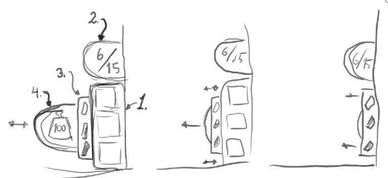 This week I took on the job of creating a UI for our game. The different aspects that our UI had to cover was a way to count and visually represent score or the goal, visual representation of an inventory for our powerups, a way to show the player how many glowsticks he or she had left. The last two things we needed to show was an inventory or counter for the carry limit and a way to show the player when he or she is over encumbered. I listed all of these things in order to keep track of what to do. When I had everything I needed I drew some quick sketches of a thought process. The three sketches above incorporates the pickup limit, our powerup inventory, glowsticks and over encumbered. The three below those are versions of score or goal counters, we went with the one on the right. It is a coin holder that fills up with coins as you progress through the level and the small box below that show the same thing but in numbers.