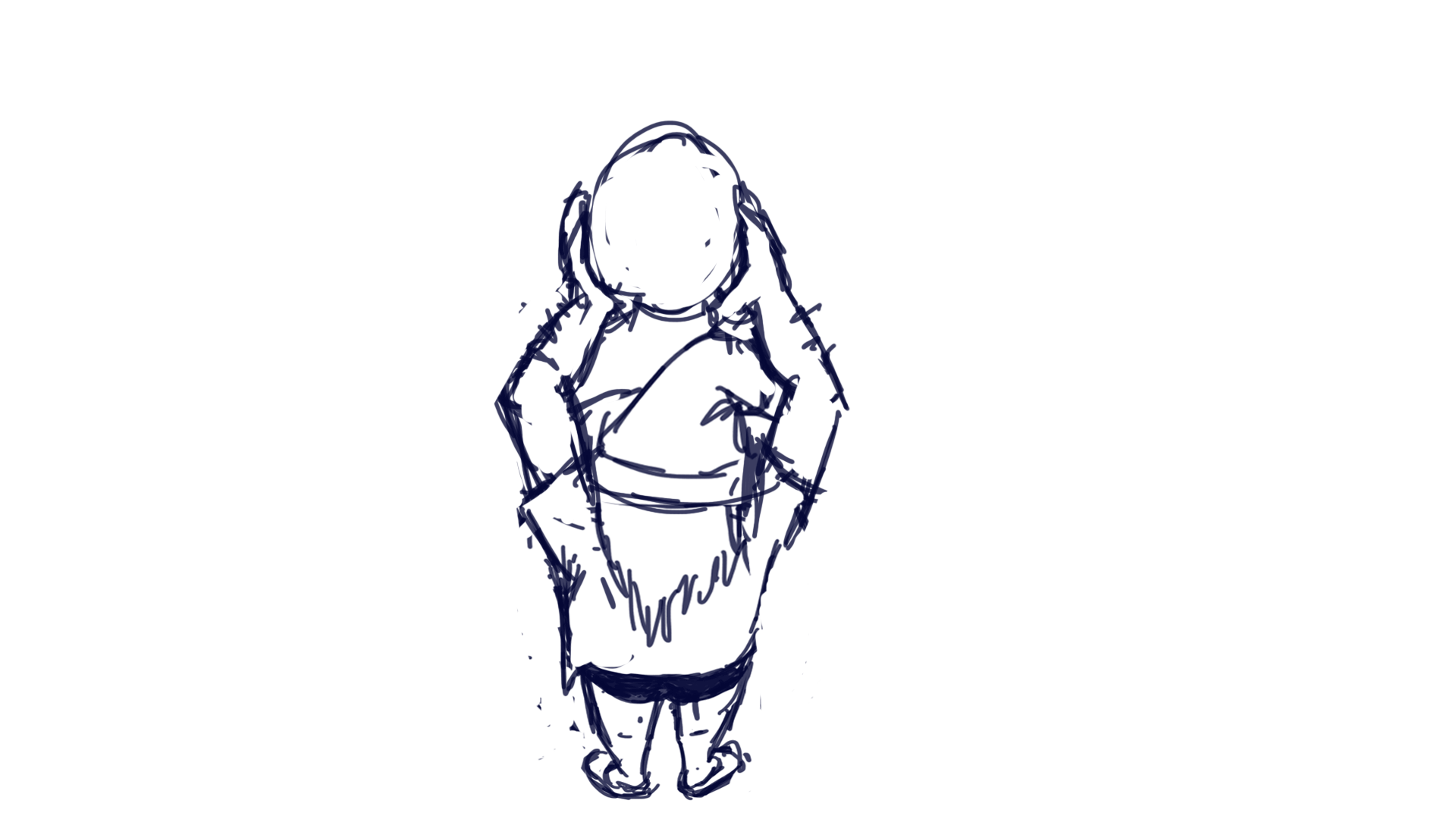 Vi diskuterade detta i gruppen och noterade att det ser lite ut som att han har gigantiska ap-armar som skulle slå i marken om han stod med armarna nedåt, lite donkey kong stil. Ett annat problem här förutom att den är väldigt slarvigt gjort är att animationen ser lite död ut, så när jag ritade om den lite renare la jag till lite animationer i tröjan, håret och hatten för att ge lite liv.