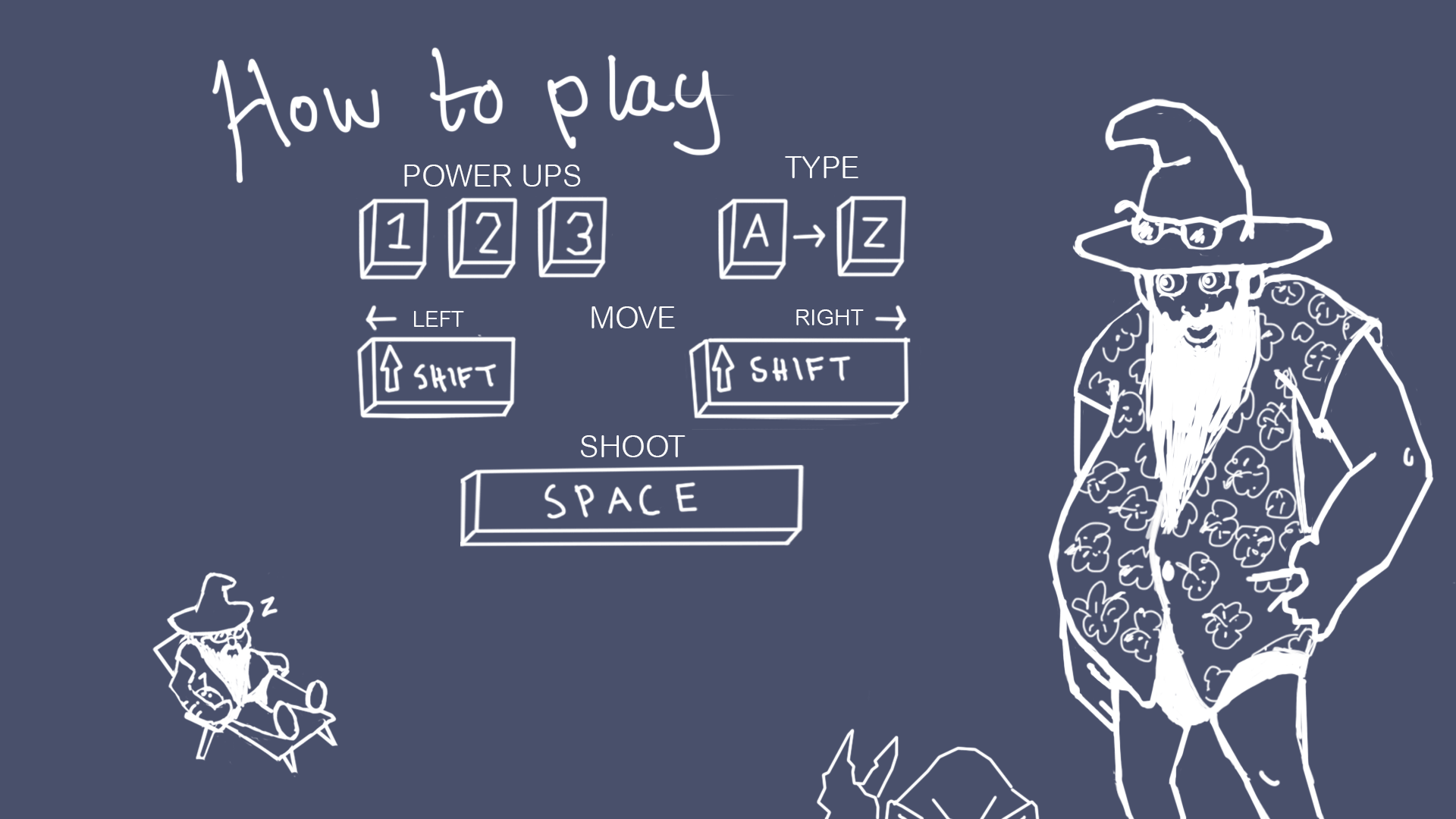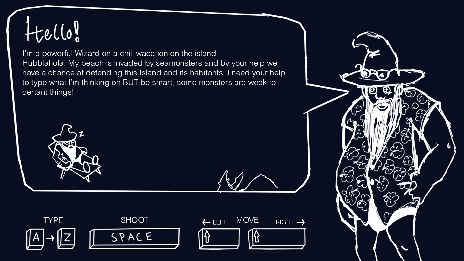 Senast jobbade jag med något som vi kallar för en warm up screen. Detta är som en mini tutorial innan spelet drar igång för att spelaren snabbt ska kunna få en bild över hur man spelar utan att behöva hoppa in i tutorial state. Vi kände att vårat spel har behov av detta för att våra kontroller är inte självklara, och för att vi vill förklara sambandet mellan att trollkarlen tänker på något, spelaren skriver det avtaren har i tankebubblan och detta spawnas i trollkarlens händer som sedan kastas på våra monster. Tanken var också att snabbt få med var power upsen ligger. Så jag började bolla med ideen att trollkarlen förklarar läget genom en tankebubbla och sedan ha några bilder under som förklarar vidare. Jag märkte att det vart plottrigt med flera bilder och jag kände att en animation kommer kunna förklara så mycket mer än en bild. Denna animation har 23 stycken frames. Jag hade ingen riktig plan när jag animerade utan skissade fram en utifrån vad som kom från mitt huvud. Jag fann en charm i det skissiga halvslarviga animationen och jobbade inte vidare på den så mycket som jag hade tänkt. Behovet fanns inte och det skulle bara ta onödig tid att göra den mer smooth. Detta blev min första sketch som jag visade för gruppen (Notera att texten under fungerar som en platshållartext och som en skiss på vad som skulle kunna stå så anmärk inte engelskan.) Detta blev resultatet: Efter lite feedback från speltextningen märkte jag att spelaren kommer inte vilja läsa texten som står i bubblan och att den är i stort sett onödig. Så jag fick justera om bilden lite och ta bort texten, finns ingen ide att ha med den om nästan ingen kommer att läsa den. Det var också meningen att allt skulle färgläggas och göras mer snyggt men fick flera kommentarer under testningen att stilen var snygg, passade in i spelet och var lite humoristisk. De tyckte som jag att den inte behövde så mycket mer jobb. Märkte också att det var lite otydligt med knapparna på bilden och fick tipset att placera om dessa för att göra de mer tydliga. La till här knappar för power-ups. En annan ide som jag fick och la till var att illustrera skrivandet på ett snyggt sätt. Jag ville först animera en hand som skriver på ett tangentbord men tiden fanns inte till för detta så jag löste det med att skriva dit tangenter med ordet ”brick” som ändrar färg precis som i spelet. Detta är slutresultatet: |