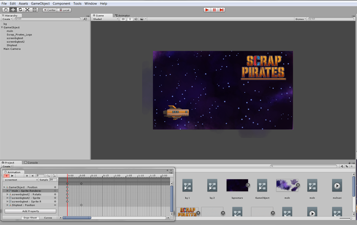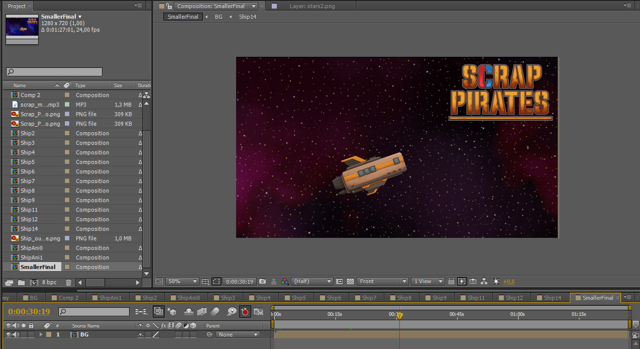 I created the first tests for the main menu in Unity, but unfortunately I had a newer version of the engine (which I hadn’t realized since I had worked very little in Unity on my own computer) so I couldn’t export the animations or anything from my version to the other members of the team. Upgrading the other team members’ version of Unity felt like a big risk to take this far into the production, so I recreated the main menu in After Effects and made it as a cutscene instead. I didn’t have that much experience of working in After Effects before this but it was a lot easier than I thought and recreating it went rather smooth. I could also time the ship animations that I did for the main menu to the music that we had, which added some comical touches to it such as the ship colliding with the game logo just as a noise was heard in the music. It ended up being a rather big file in the end though, so that was a disadvantage with the video version of the menu.