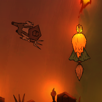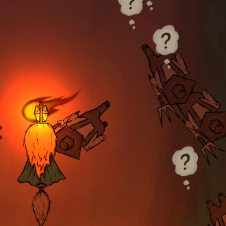 After implementing the effect I watched a few players play the game that were unaware of the movement speed change, and they seemed to subconsciously be aware of it, as they would stop firing when enemies got close to them in order to back off. Question Mark Another feature that people didn’t notice in testing is that the farmers get confused for a bit and stop chasing you if you teleport outside of their vision cone. To solve this I needed to add some indicator that makes it apparent that the farmer gets confused. The simplest way to do this was just to add a question mark that floats from the farmer’s head when he gets confused. Drawing the question mark was easy, I just drew line art, colored with a basic colour and then added some “painted” brush strokes by mixing in a few different colour values with different opacity, this was done to keep the painted style of the effects we had. To implement it, I just made a prefab game object with the texture that got spawned every time a farmer enters their “confused” script, and added a script on the question mark object that destroys itself in a few seconds after spawning. This how it looks in-game: