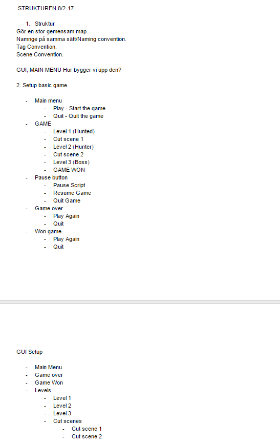 So in the beginning i did not really know what the team wanted me to note, do or fix. I stayed a little in the background to see if there was a clear thing missing that i could help out with. Unfortunately ( rather the opposite ) for me my team did a lot of thing by themselves. I was trying to think of something i could do but could only remember what the teacher Monica told me ”As a project manager, try to act like the designers right hand. If the designer needs any help you should help him”. So i asked Joel, Our designer, if there was anything i could do. It turned out he wanted me to note as much thing i could during meetings. The result was me noting ideas, small things to add in the backlog. One thing i documented really detailed was the new systeming of the folders we were gonna use in Unity. This looked something like this: