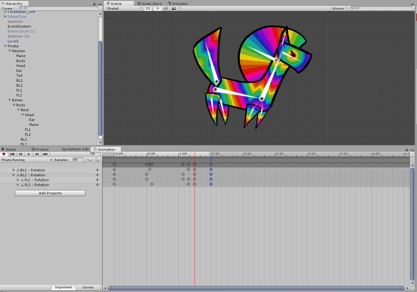 This week was mainly dedicated to finishing up on last week’s assets and touching up some older ones to make everything more coherent although most of my time was dedicated to cleaning up the main character and animating him again. Before going into detail about this week’s main task, I have found the time this week to finally get rid of a thorn in my eye. Wrath of the seven deadly sins, represented by a bear, has happily been moved to the trash folder to make place for the new and slightly better version. The earlier bear felt out of place from the start and I could not wait to get rid of it. Although the newer version is not my best work, it feels and looks a lot better with the rest of the seven deadly sins. My earlier assets and animations for the main character were part of the older concept and had to be changed now that we are working in the other direction. For the last few weeks that mainly meant making new enemies that would fit the new story we had made up. The old main character was not going to change much and could pass for the time being, thus it was planned that the adjustment of the main character would be done near the end of production. Now that the time has come to rework him, it meant that it was finally time for me to tackle animation in Unity. I would be working with bone animation which I have struggled with before. I have learned from my earlier mistakes when drawing the main character and I have tried my best to avoid the same mistakes as I did then. Instead of having too much different parts and colours on one layer I made extra effort to separate everything and have made it into a proper clip doll. If there is ever a change needed I can now easily go to the Photoshop file and adjust what needs to be adjusted unlike the previous time, which has basically put me into this mess. The basic design did not change much from the original. The cardboard colour behind the piñata has been removed entirely and I redrew the design to make sure I had every little piece on a separate layer. The colour scheme and pattern has stayed the same as well except for the addition of another hue of purple. I felt as if the yellow and blue shades got too much space on the canvas so I added purple to make the transition from blue to pink smoother and longer. Below shows the transformation of the main character throughout the production process. A new method of animating brings new challenges! I’ve spent a large chunk of this week learning how to do bone animation in Unity. After a few hours of tutorials, some tinkering in Unity and a lot of help from my fellow team member André I managed to put together a working bone animation. Now, this did not mean it looked like anything decent, but it moved. Many a tear shed in joy! After the joy of seemingly completing the giant that is bone animation, I got critical. Compared to the result of my previous animation, which was done in Photoshop, I felt as if the smoothness of the Unity bone animation system made it look almost too smooth. The animation I had made looked as if the feet were dangling in the air and had no real weight to them. With an animation as smooth as the one in Unity, mistakes are easy to spot. When I started out with the animation I failed to realize how difficult that would make it. A lot more tinkering will be needed before this would be a good looking and good feeling animation, but I feel quite proud of managing an animation in Unity!