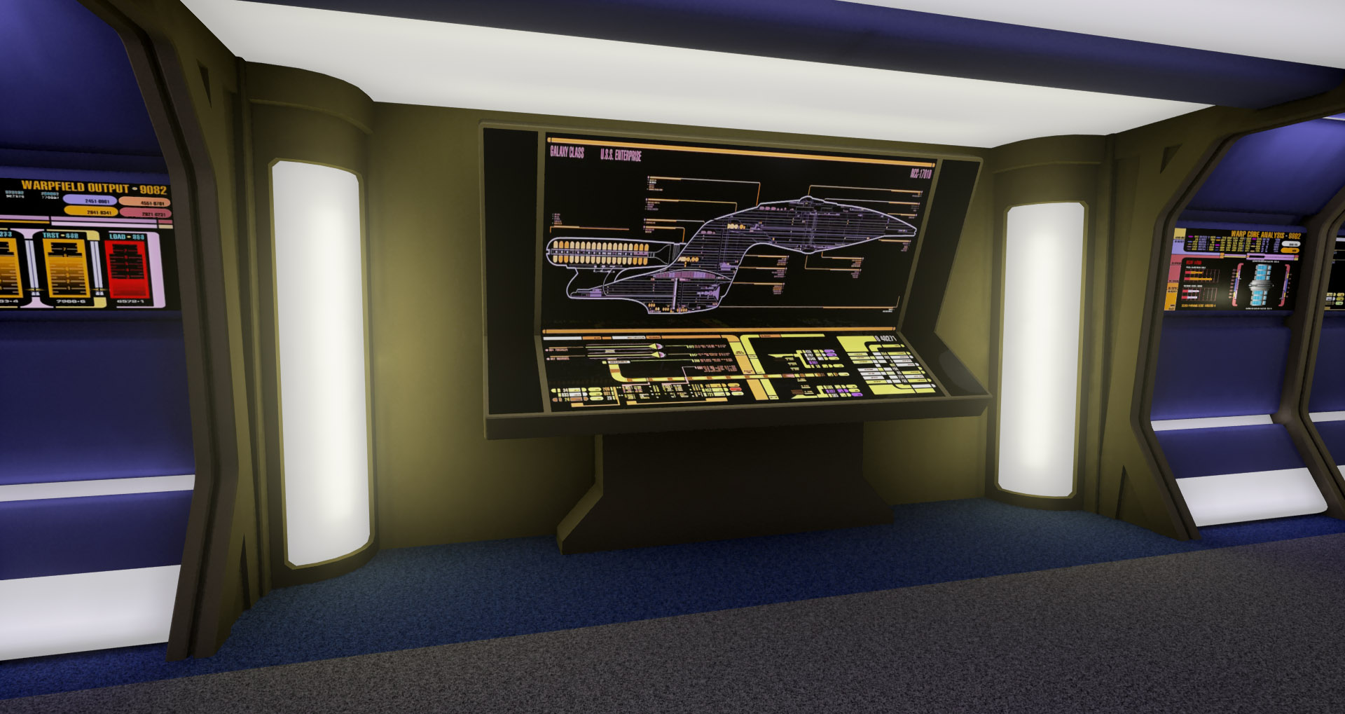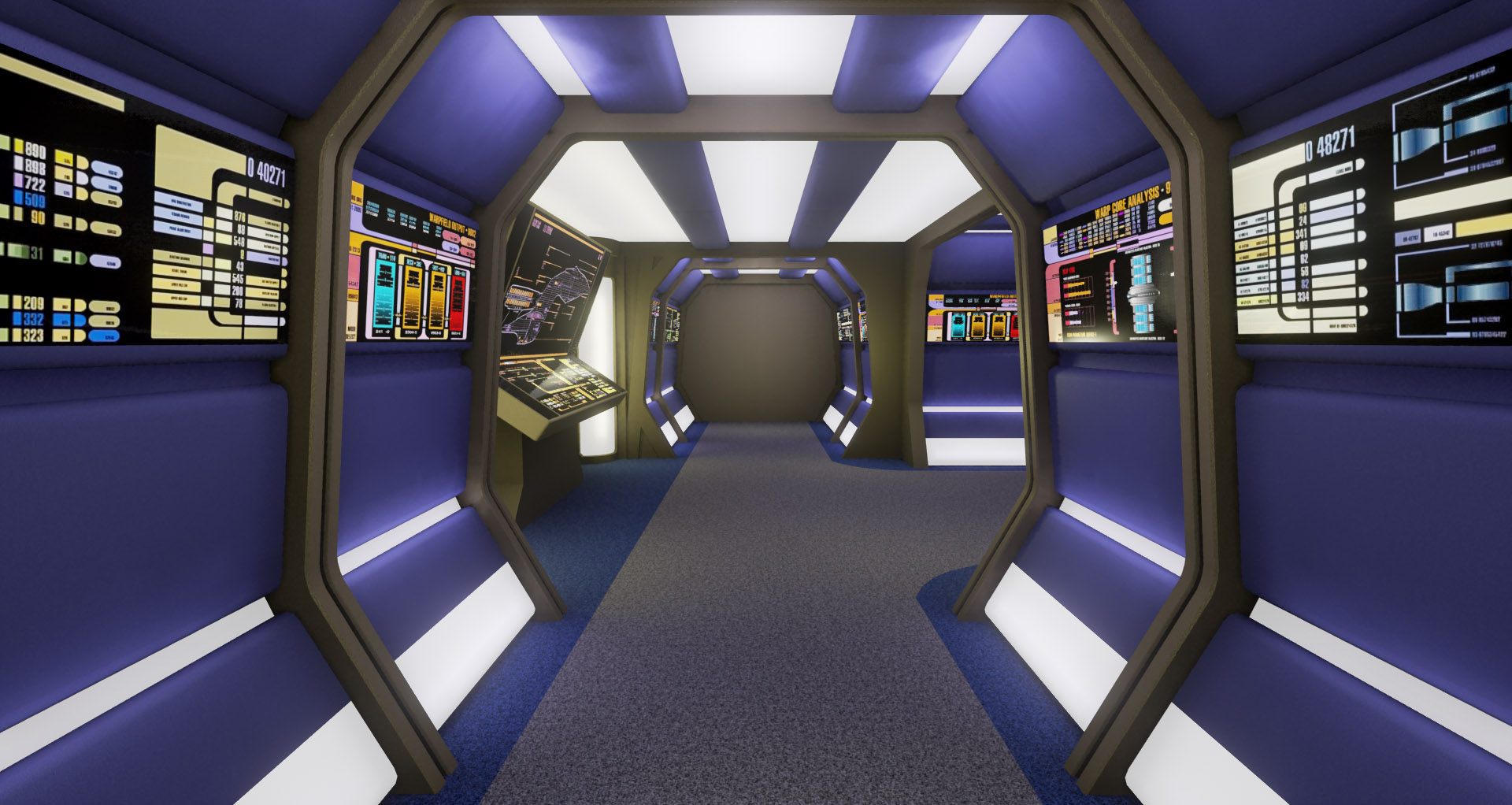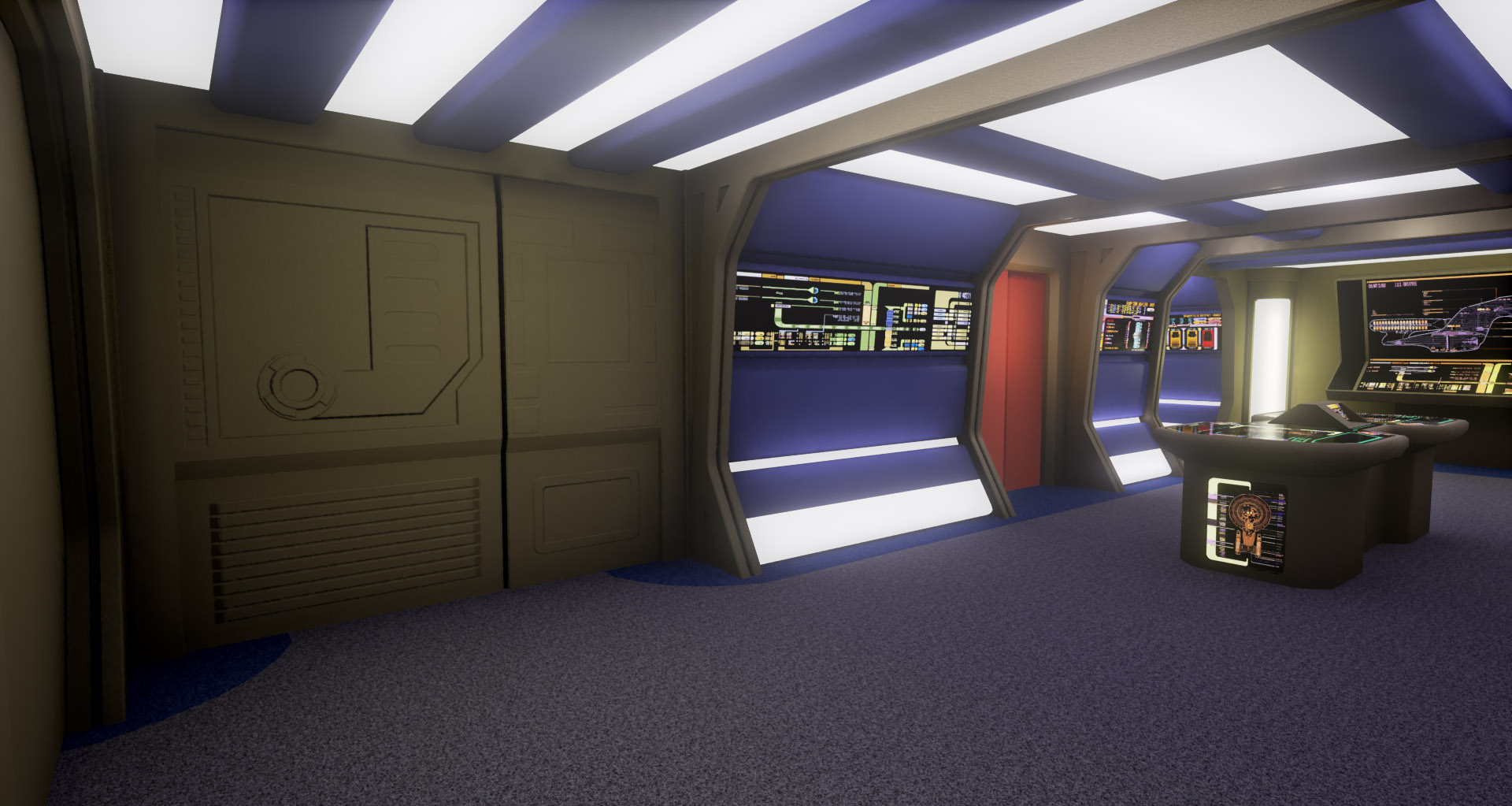 This is a modular environment representing an engine room hallway of the Star Trek starship Enterprise-D. It was created in fall 2015 during a 3D environment course taken at Uppsala University for my bachelors degree.