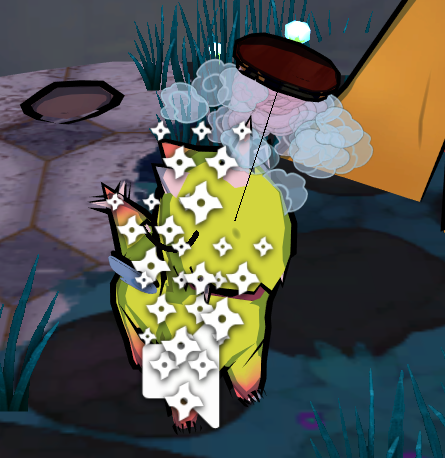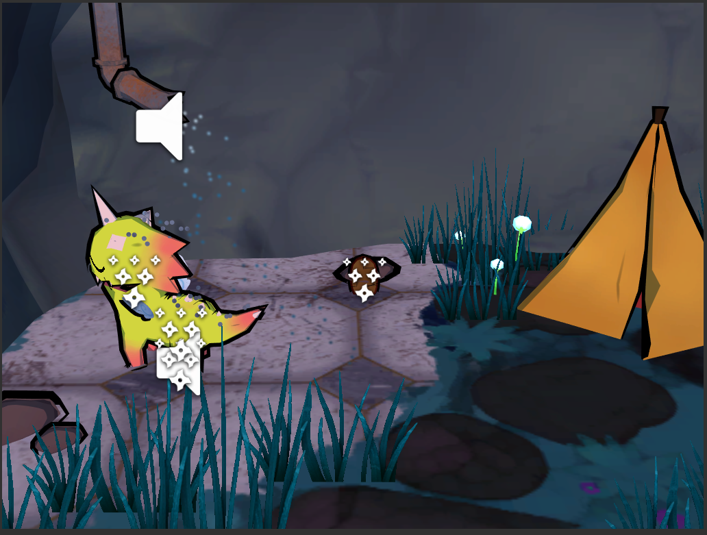 The brush is using a similar system. It has a collision box through which a message is sent when the player is touching it. The difference here is that the brush, when activated follows the movement of the players touch. If the player releases the touch, the brush returns to its original position or ”station”. When the brush is touched a particle effect is activated, visually showing the player that the brush is ”On”. I then created, like with the touch system, a ray that shots out from the brush in the direction of the critter. Rather the whole brush is always pointing its brushes towards the critter, to ensure that the brushing looks correct no matter the positioning of the critter. If this ray then collides with the critter, the critter will be brushed and the happiness-stat will increase. To show to the player that this works the brush sends a message to the critter to activate the brush function, which changes the animation of the critter.