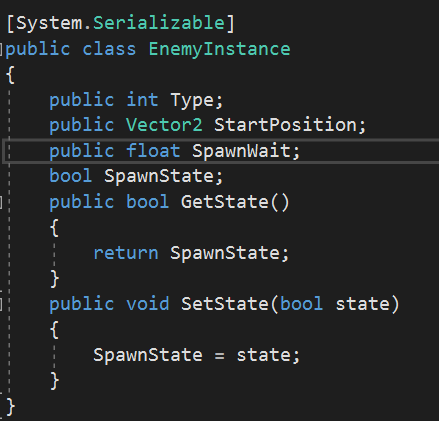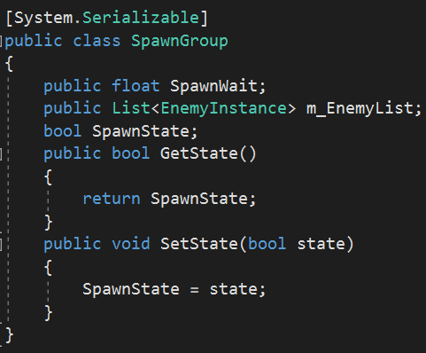 The first script is a empty class with 2 functional classes, “SpawnGroup” and “EnemyInstance” the SpawnGroup is basically holding a list of EnemyInstance, a bool which indicate if this group of enemies are created or not and a float represents the time interval after the last group.  And the EnemyInstance class Contains a bool to indicate if the enemy has been created, a float of the interval between each enemies, a int of the type of enemy and a Vector2 represents the spawn position.