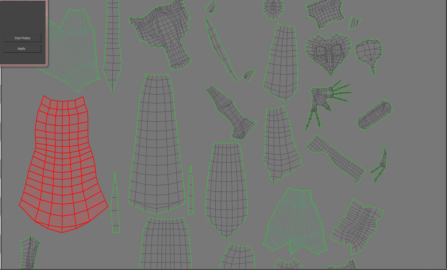 Before moving on to the rigging and skinning of Nihteana, the character I have been working on, I UV-mapped her. Doing this I encountered something which I have not before. Max just did not seem to want to relax the pieces properly, even though there should be no problem with the seams and all the pieces would just shrink and shrink until manually stopped.